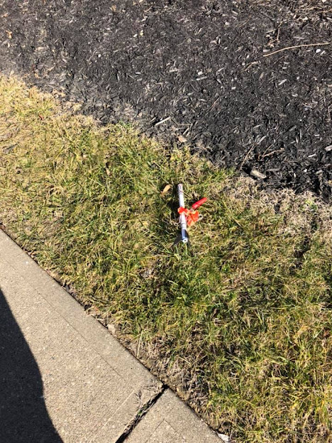 Not the clearest photo in the world, but you can tell that the road was the landing area. I dropped the launcher and walked slowly toward the spot (a balky knee was giving me issues on this particular launch day.) As I was walking toward it a small bus came up the hill, swerved and drove directly over top of the rocket. The parachute filled and followed the bus up the street 100' or so. Luckily there was no other traffic. The Wizard survived with a gash on a fin tip and some paint scrapes. I survived but for some knee pain, and I had Advil waiting to snack on when I got home. The total for two days of abbreviated flying, two lost fins, one gashed fin, two boots clotted with goose poop. Winner.