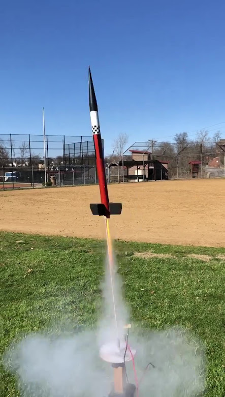 This would be an A3-4T flight, because I wasn't of a mind to care. It would also be nose blow recovery for the same reason. Windcocked left as expected. Altitude was impressive, around 400' well over the softball outfield. I initially thought it was going to recover there, but it drifted back my way and came in fast on the baseball infield where it was recovered without damage.