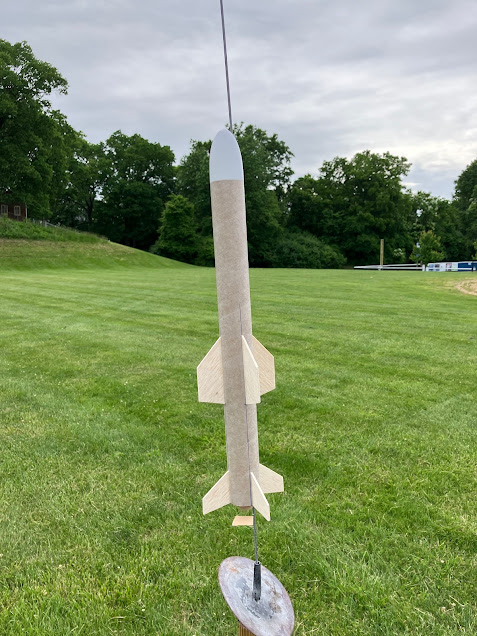 I have a complicated history with flight #6. Back in 2001, I was desperate to clone the Estes Satellite Interceptor, one of the rockets from my 1977 fleet that I never got the chance to fly. I figured out that the most recent Estes offering to use the nose and tail cone from the SI was the Wildfire, so I set out to find myself one. No one locally had one, even the Greenhills Johnny's, which was my go-to for OOP kits. I religiously checked eBay, and after several weeks I got a notification about this rocket. It was marketed as a built Estes Wildfire and the pictures were not great, but I decided to take a chance on it. I was the only bidder. When it arrived a few days later I realized that it was the wrong size, a BT-55 versus the BT-50 I'd been expecting. I realized that I had a spare PNC-55BB and decided to builf an upscaled Satellite Interceptor, then bought more cones and built an upscale WAC Corporal and a Cherokee D. (Don't ask.) After a few weeks I grudgingly gave the fake Wildfire a chance to fly and called it the Flying Turd. The Turd flew like a champ in 2001. 22 years later it was back for another chance.