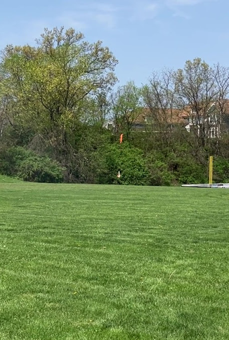 The Alpha would provide my pucker flight of the day.  It was an A8-3 flight, perfectly reasonable for conditions.  I loaded the red parachute in it because it was apparently lucky.  Most of the flights on the day had leaned to the left off the pad and recovered right out from me near the center of the field.  Not this one.  The Alpha went straight out from me off the pad, climbing to 302' before uncorking in deep center field.  The breeze was apparently strong over there and it immediately began racing toward right field.  Right field is sloppy and mucky at this time of year, but that's not a big issue.  The softball fence is twenty feet off the foul line, and the fence looked to be in play.  At one point the Alpha looked to catch a thermal.  Just what I needed.  I lucked out and the thermal found someone else to torment and the Alpha landed safely in the muck.