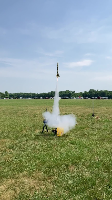 Looking at this pic now, I can see where my problems started. I'd been using the 3/16" rod on pad A-4 all day with great success. For this flight I'd negated to check the rod angle, and since my earlier flight, someone had adjusted it straight up instead of leaving it angled back toward the soccer fields. This inattention to detail would prove costly. The E12-6 flight left the pad heading straight up and slightly right, not angling out toward the soccer fields as I had grown accustomed. I knew it was in trouble right away, but you likely know the feeling. All I could do was watch. The flight ended short of 1000' just as the rocket tipped. It began drifting back across the flightline, falling quickly, but nowhere close to quickly enough. It crossed Rip Rap Road and settled into the upper branches of a tree. One of the spectators was excited to have tracked it and couldn't believe I wasn't going to go full arborist to get it back. I told her that a man has to know his limitations. Back to trolling old hobby shops, I guess.